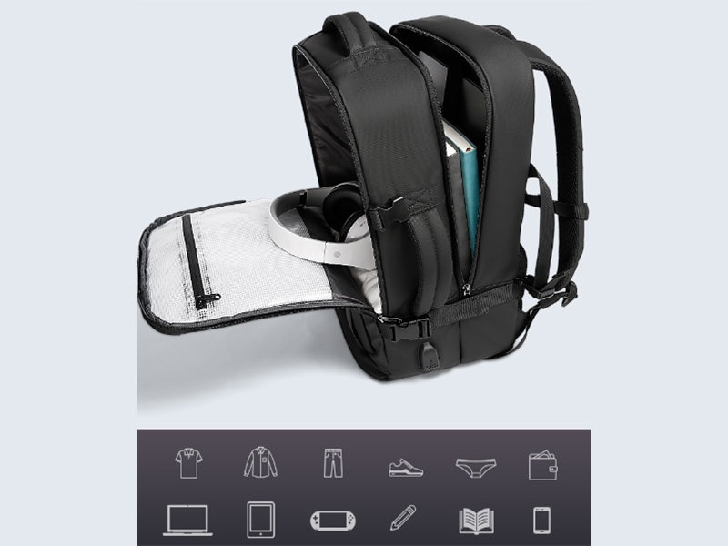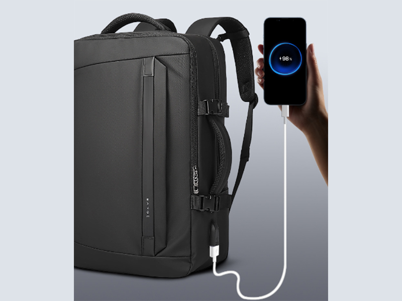 در طراحی کوله پشتی ضد آب بنج پورت USB میبینید که برای شارژ کردن موبایل یا هر دستگاه دیگری قابل استفاده است که در قسمت خارجی کیف در سمت چپ قرار دارد. تلفن خود را در دو مرحله آسان شارژ کنید: