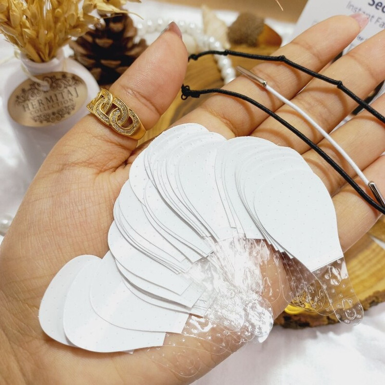 چسب لیفت صورت و شقیقه 40 عددی رفع چین و چروک پوست صاف شدن پوست صورت بالا بردن شقیقه لیفت و بالا کشیدن چشم و ابرو بدون رنگ و نامرئی قابلیت محو شدن زیر آرایش مناسب برای همه سنین بدون آسیب به مو نصب راحت و آسان و بدون درد سفت کننده پوست مناسب برای مجالس و عروسی هر بسته شامل 40عدد چسب مراحل نصب چسب لیفت صورت و شقیقه 1. پیش از نصب چسب موهای خود را به سمت بالا جمع کنید تا با اینکار بندهای چسب مخفی شود 2. پس از باز کردن چسب نیمی از آن را بر روی پوست شقیقه خود قرار دهیدحتما توجه داشته باشید که محل نصب کامل دقیق انتخاب شود که باید دنباله رو ابرو باشد 3. سایز بند چسب را بصورت حدودی تعیین نموده و یک بند را از دیگری رد کنید 4. پس از رد کردن بند از سوراخ بند دیگری آن را از زیر موهایتان رد کنید 5. چسب دوم را نیز دقیقا طبق همین مراحل نصب نماییدچسب دوم باید با چسب اول در تقارن باشد که در غیر اینصورت موجب نامتقارن شدن ظاهر لیفت پوست صورت خواهد شد 6. پس از طی این مراحل امکان آرایش مو برایتان فراهم می گردد نصب چسب را باید پیش از آرایش صورت انجام دهید