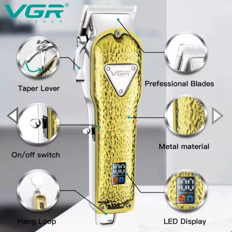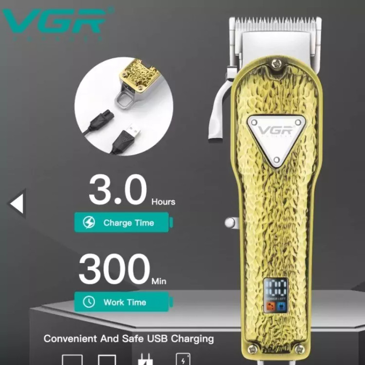 بررسی اجمالی محصول برند VGR مدل V-142 طرح پوست ماری مخصوص اصلاح حجم زن و سایه ست شانه اصلاح اهرم مخصوص تنظیم تیغه صفحه دیجیتالی باتری 2500 میلی آمپری فول شارژ در 3 ساعت کارکرد 300 دقیقه مخصوص سالن